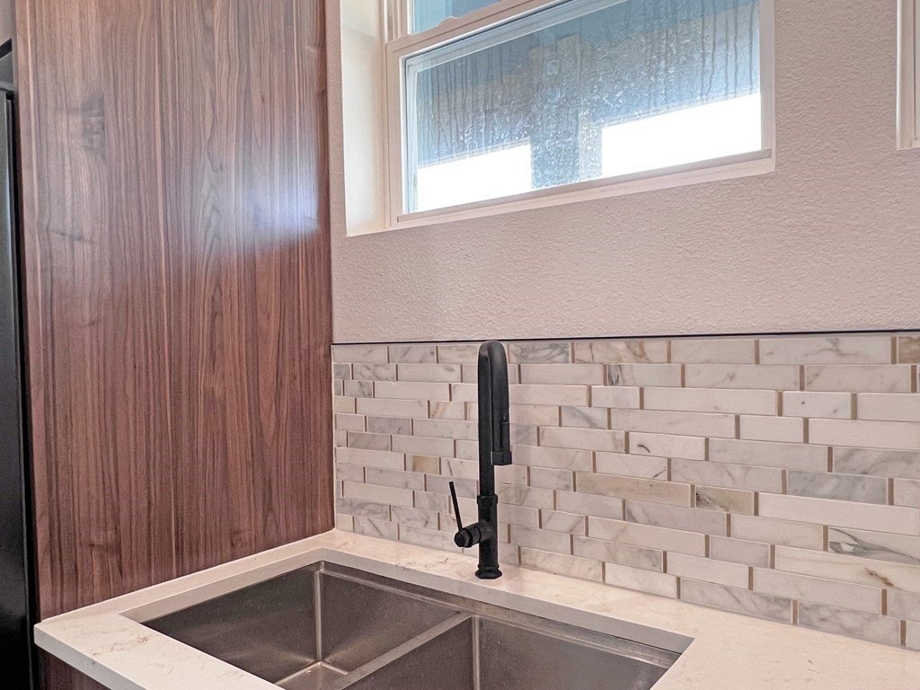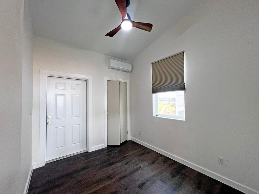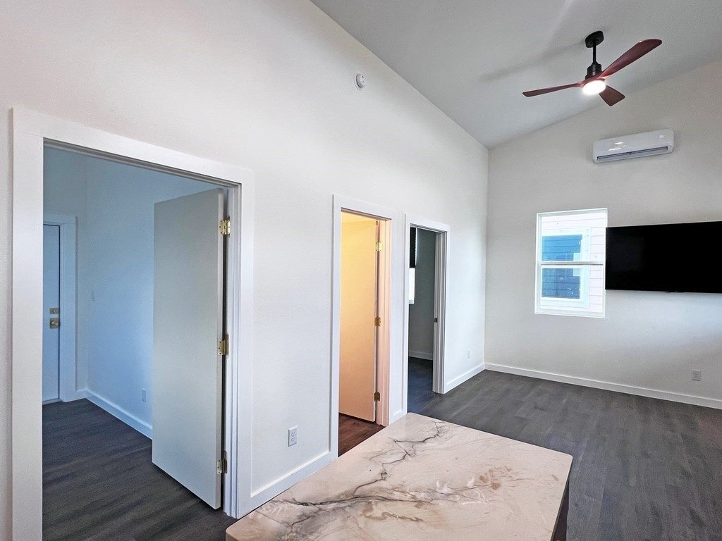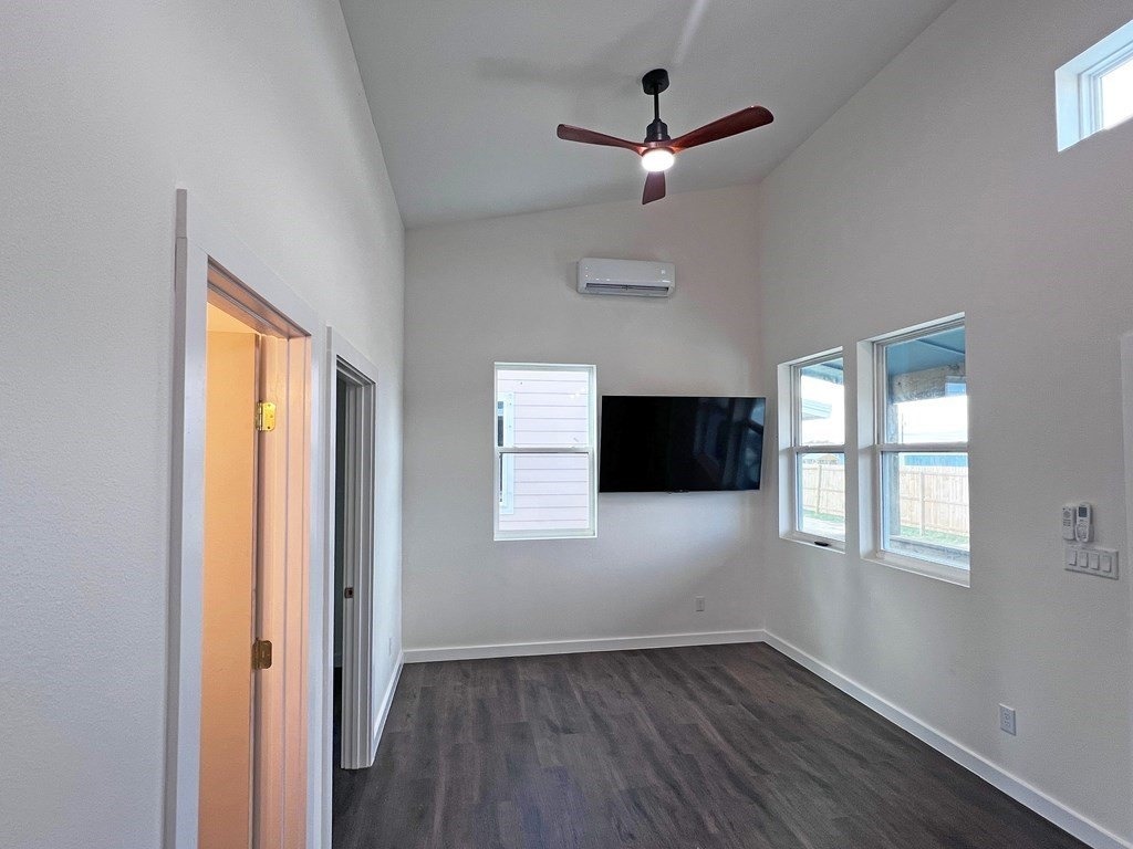 Experience modern living in this stylish 2-bedroom, 1-bath home completed in 2024. The open layout features soaring 14-foot ceilings, luxury vinyl plank flooring, and a subtle mid-century feel with upgraded lighting and clean, modern finishes. The kitchen includes quartz countertops, a marble backsplash, full-size appliances, and a versatile rolling island that can be used for prep, dining, or entertaining. The bathroom offers a custom tile tub/shower combo and a double-sink vanity for added convenience. A dedicated laundry closet fits full-size washer and dryer units, and a wall-mounted TV is included. Outside, enjoy a fully fenced yard and a 6’ x 24’ covered deck perfect for relaxing or entertaining. Two dedicated parking spaces are provided. Because the community is new, GPS may not recognize the street yet. Use 2351 W Market for navigation. 12-month lease required. One small dog may be permitted upon approval (breed and size restrictions apply) This property does not allow cats. Washer Dryer connection, Wall mounted tv included, Fenced yard